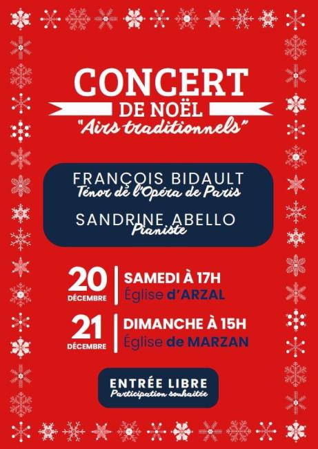 Concert de Noël par le ténor de l'opéra de Paris, François Bideau et la pianiste Sandrine Abello. Vin chaud et brioche de Noël offerts par la municipalité à l'issue du concert, devant Le Mille Feuilles.