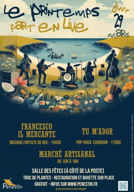 Concerts : Francesco Il Mercante, musique/artiste de rue, à 15h30. Tu M'ador, pop-rock/chanson, à 17h00. Marché artisanal, de 10h à 18h, troc de plantes, restauration et buvette sur place.