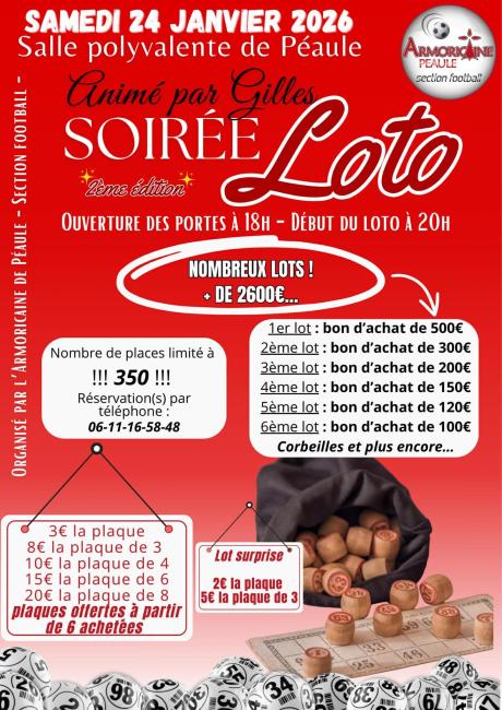 Organisé par le CSSG Allaire football. À gagner : des bons d'achat de 1000 € à 20 € et de nombreux autres lots. Animé par Johnny. Ouverture des portes à 18 h. Boissons, sandwichs, frites, gâteaux sur place