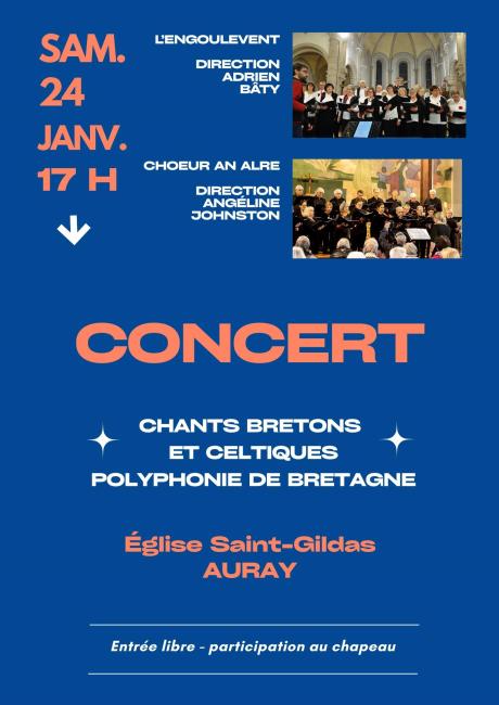 Chants bretons et celtiques polyphonie de Bretagne. L'engouement sous la direction d'Adrien Baty, Choeur An Alre sous la direction d'Angéline Johnston. Entrée libre au châpeau