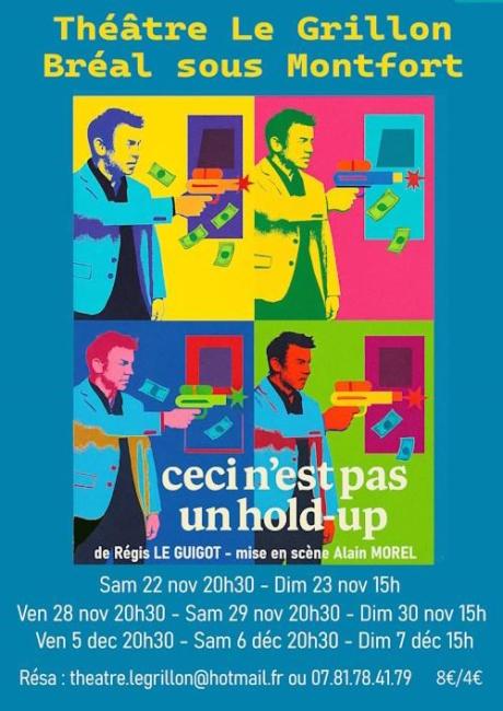 La troupe du Grillon présente Ceci n’est pas un hold-up comédie de Régis Le Guigot Mise en scène Alain Morel. La carte bleue de Jacques vient d’être avalée par le distributeur. Qu’à cela ne tienne, un rapide détour par le guichet de la banque et le tour sera joué.