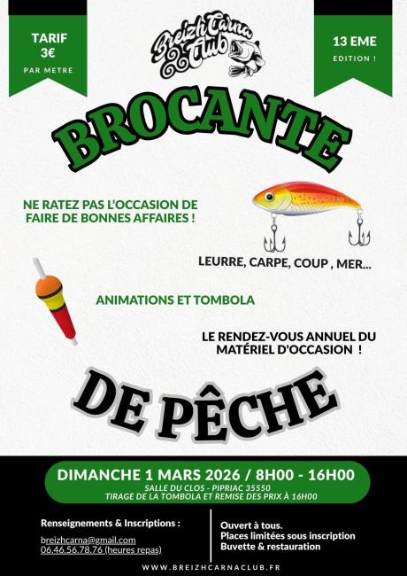 Braderie de pêche du Breizh Carna Club, 13 ème édition de la braderie du Breizh Carna Club, 3€ le mètre, réservés aux particuliers. 8h00 ouverture des portes aux visiteurs, buvette et restauration sur place.