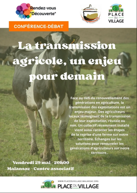 "Face au défi du renouvellement des générations en agriculture, la transmission des exploitations est un enjeu majeur. Des agriculteurs locaux témoignent de la transmission de leur exploitation, réussie ou non. Un collectif récemment installé vient aussi raconter les étapes de la reprise d’une ferme sur notre territoire. Echanges sur les solutions pour renouveler les générations d'agriculteurs sur notre territoire." Reprendre aujourd’hui, cultiver demain.