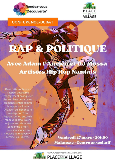 "Dans cette conférence rappée, découvrez l’engagement politique et les combats des artistes du monde entier comme la rappeuse Sonita Alizadeh qui dénonce le mariage forcé en Afghanistan ou encore le rappeur Toomaj Salehi, toujours emprisonné et condamné à mort pour son soutien en musique au mouvement Femme, Vie, liberté... Avec Adam l'Ancien et DJ Mossa, artistes Hip Hop Nantais"
