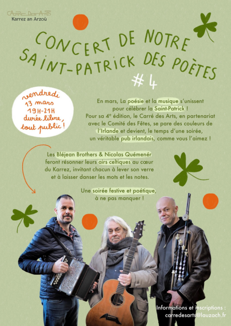 Soirée St Patrick organisée par la St Léon Glénac. Repas : burger (viande : steak haché) + cookie. Repas fait maison Un DJ sera là pour animer la soirée (DJ : magic dance). Différentes bières à déguster. Animations sur place. Lieu . salle des sports à Glénac.